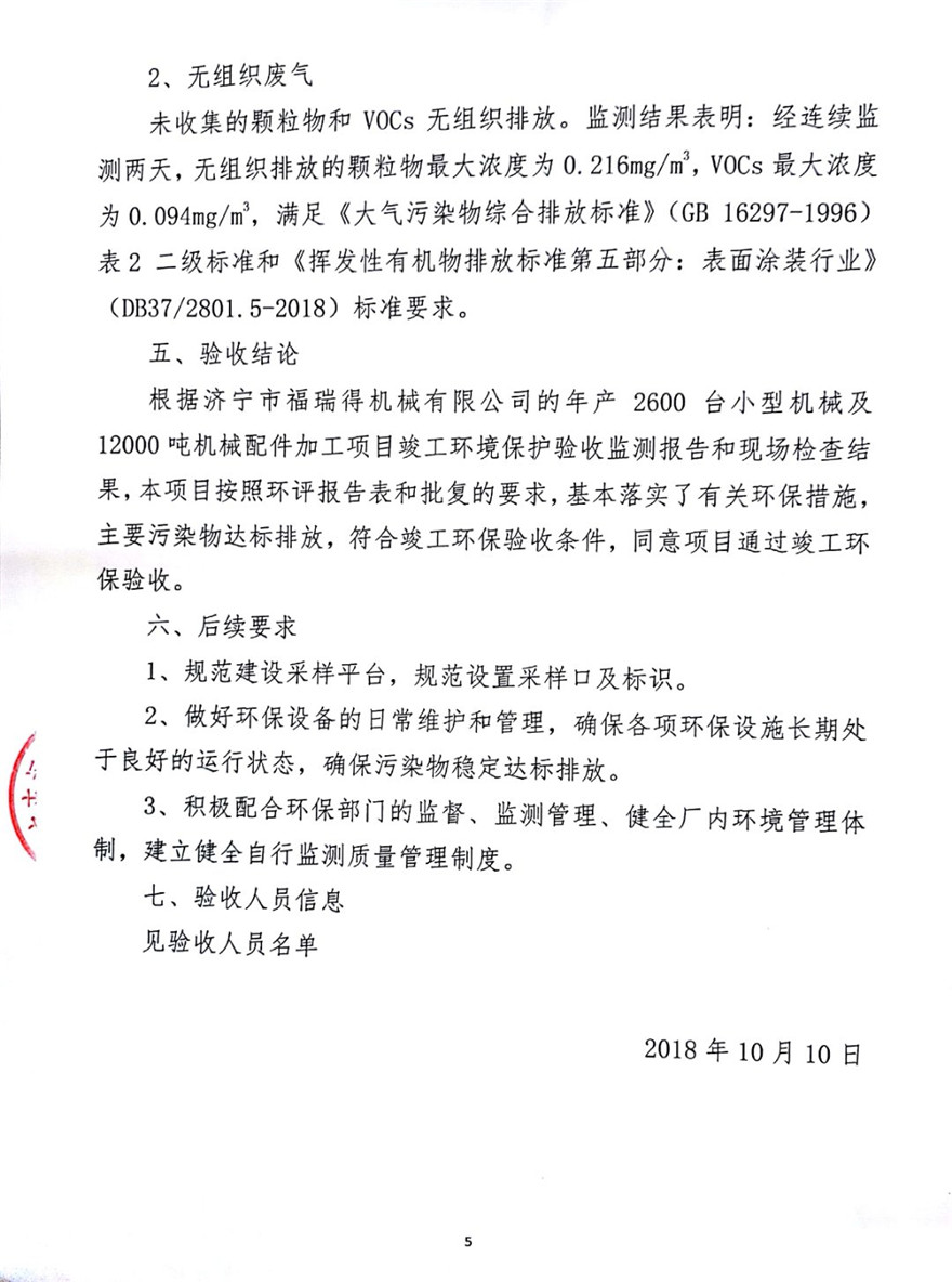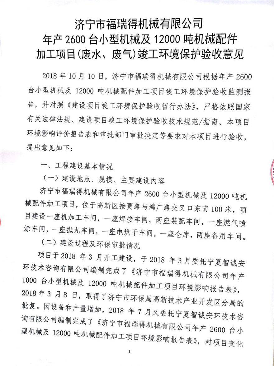 濟寧市福瑞得機械有限公司年產(chǎn)2600臺小型機械及12000噸機械配件加工項目(廢氣、廢水)竣工環(huán)境保護驗收意見