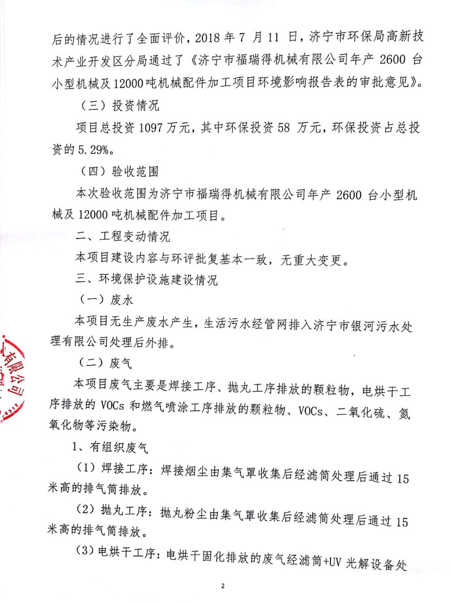 濟寧市福瑞得機械有限公司年產(chǎn)2600臺小型機械及12000噸機械配件加工項目(廢氣、廢水)竣