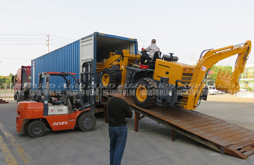 9月17日 福瑞得機(jī)械1臺(tái)挖掘裝載機(jī),1手扶壓路機(jī)和1臺(tái)平板夯打包、裝箱出口澳大利亞。