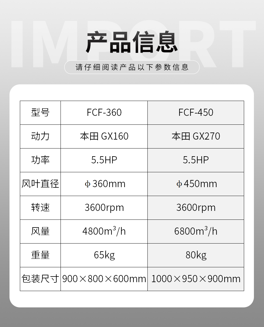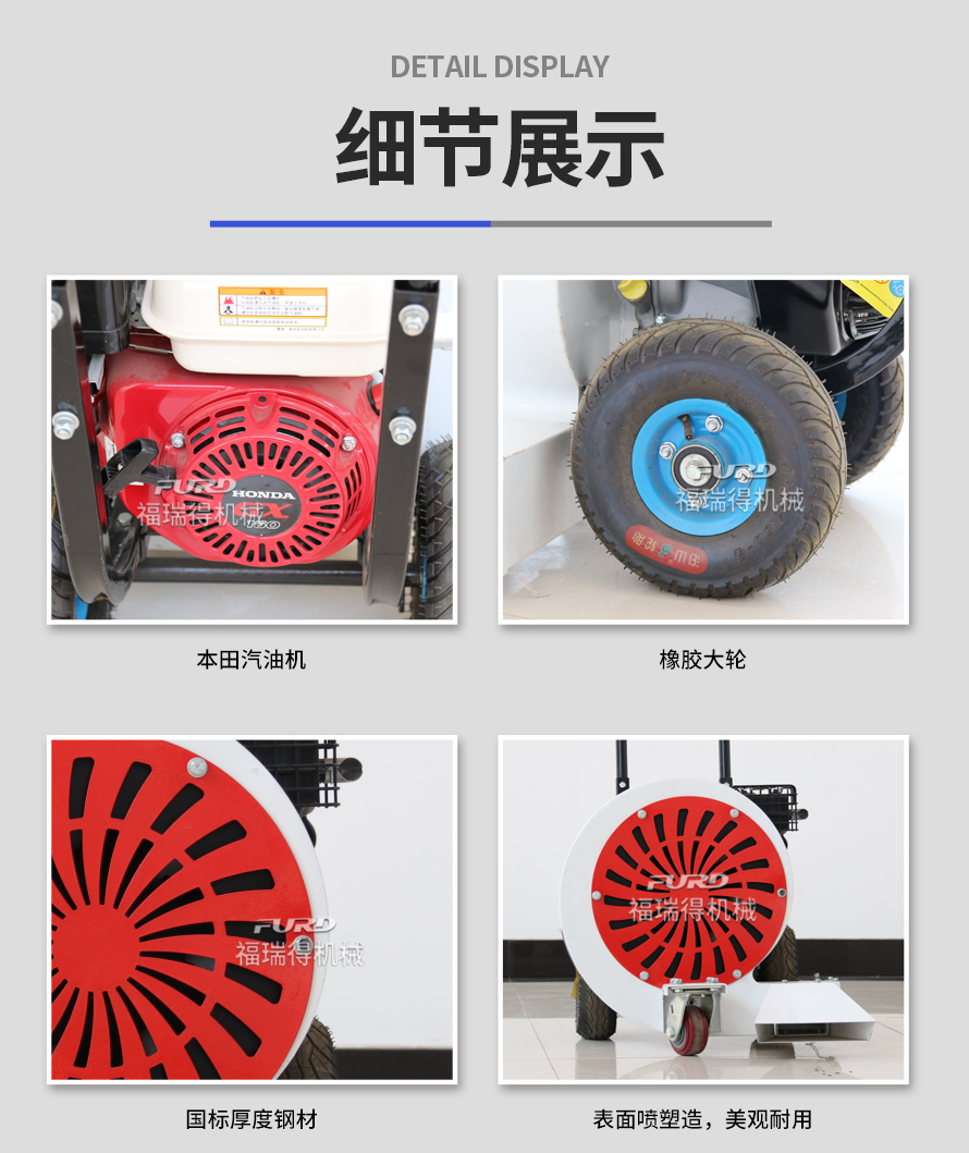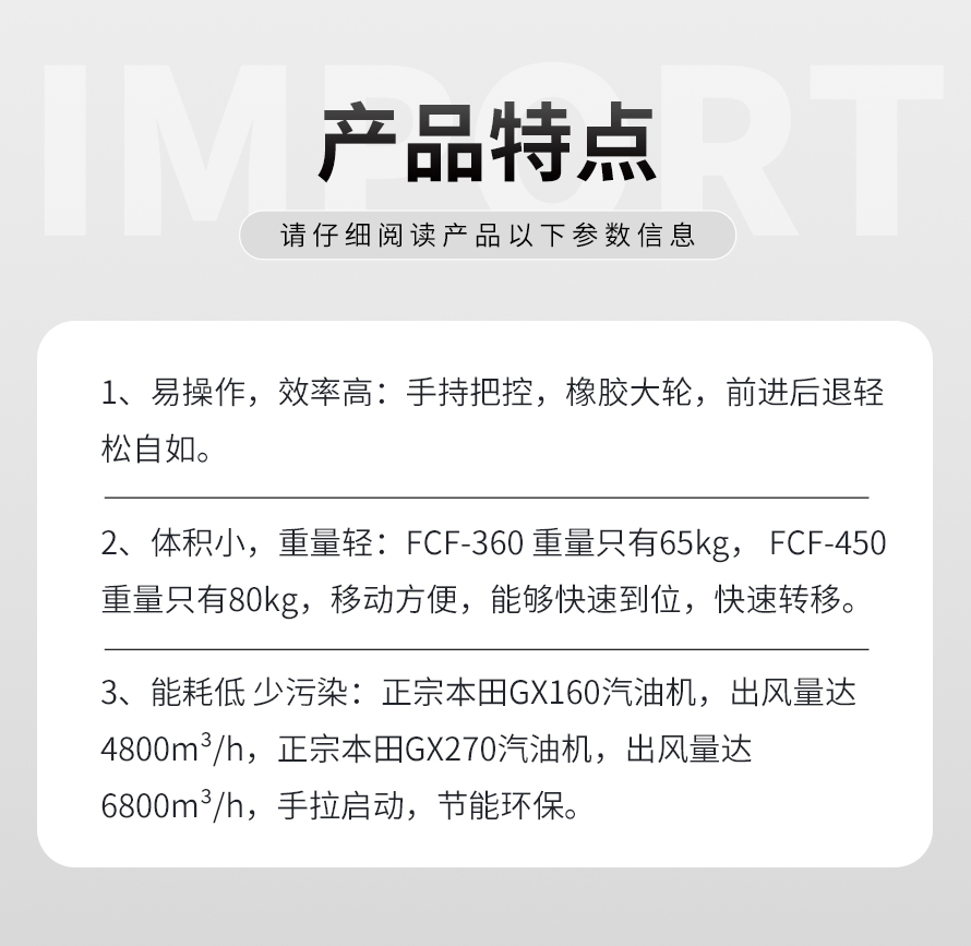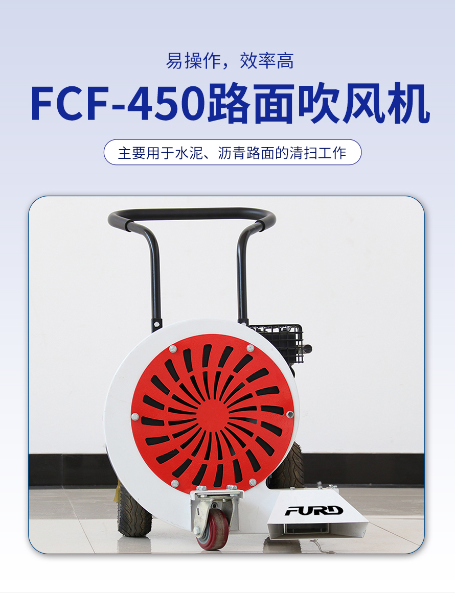 FCF-450路面吹風機采用本田汽油動力,性能穩定。風葉動力平衡性強,保證整體的穩定性。大風量,性能優越。