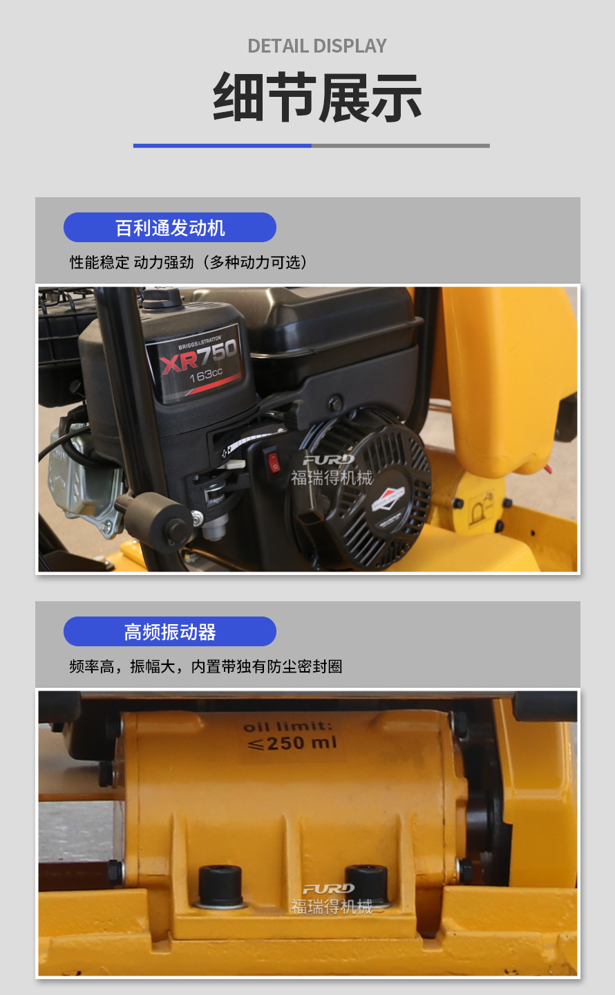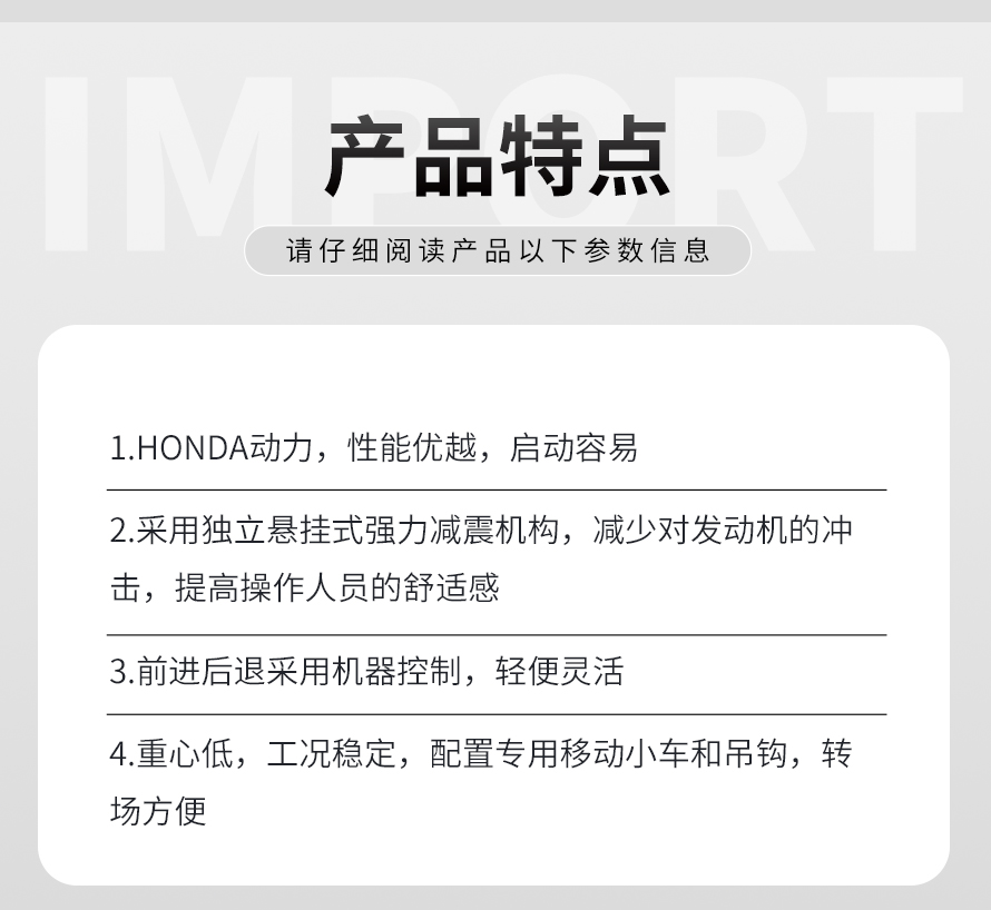 適用于路基邊緣、橋涵、管道、溝槽底部等狹長地帶的壓實(shí)。 本田汽油動力,名牌品質(zhì)保證。